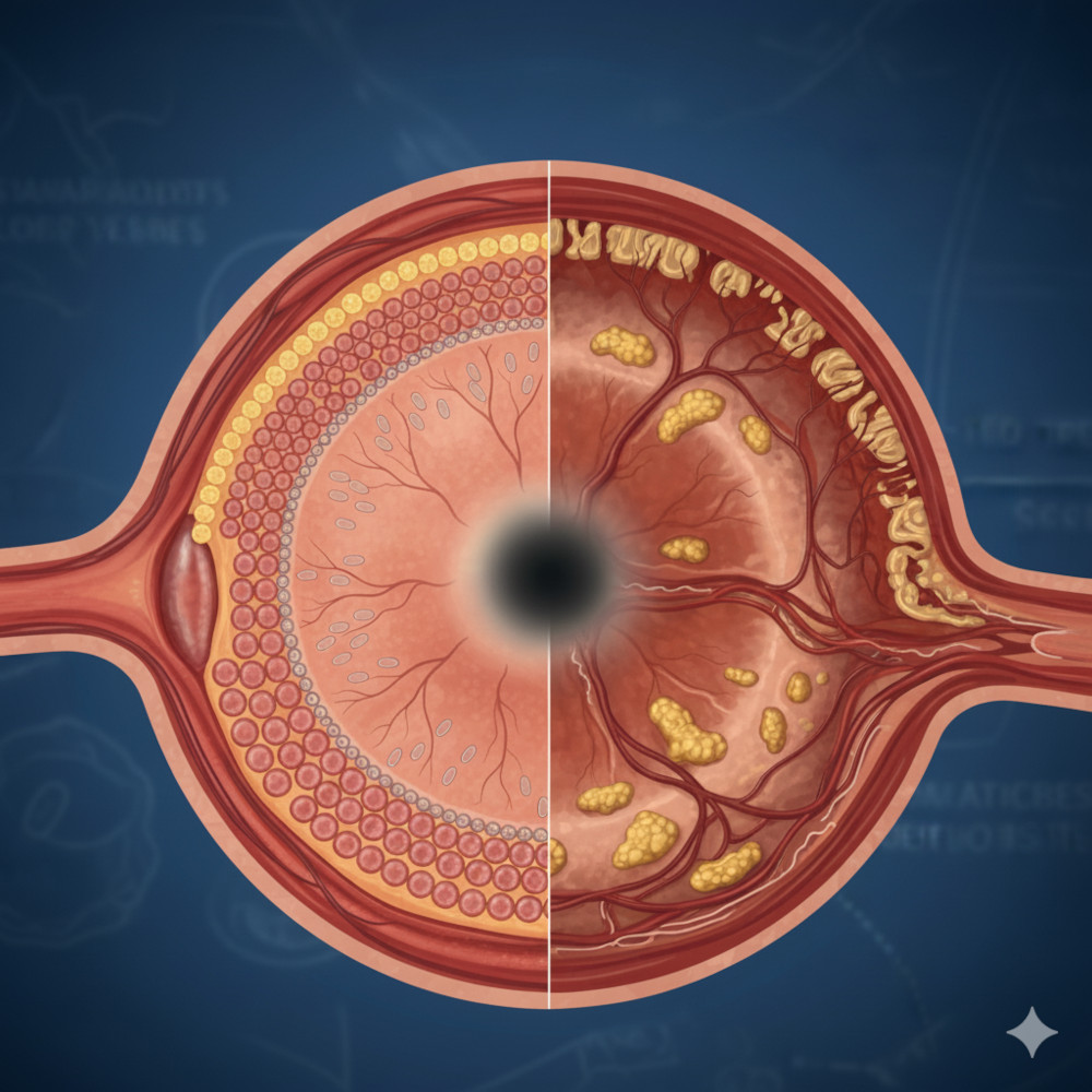 Poškození žluté skvrny je způsobeno hromaděním produktů metabolismu a dochází k poklesu centrálního vidění, periferní zůstává nedotčené. Postižení mohou vidět šedou skvrnu nebo stín uprostřed zorného pole. Čáry a objekty jsou vnímány zkresleně nebo „posunutě“. Může také docházet ke změnám v barevném vidění.
